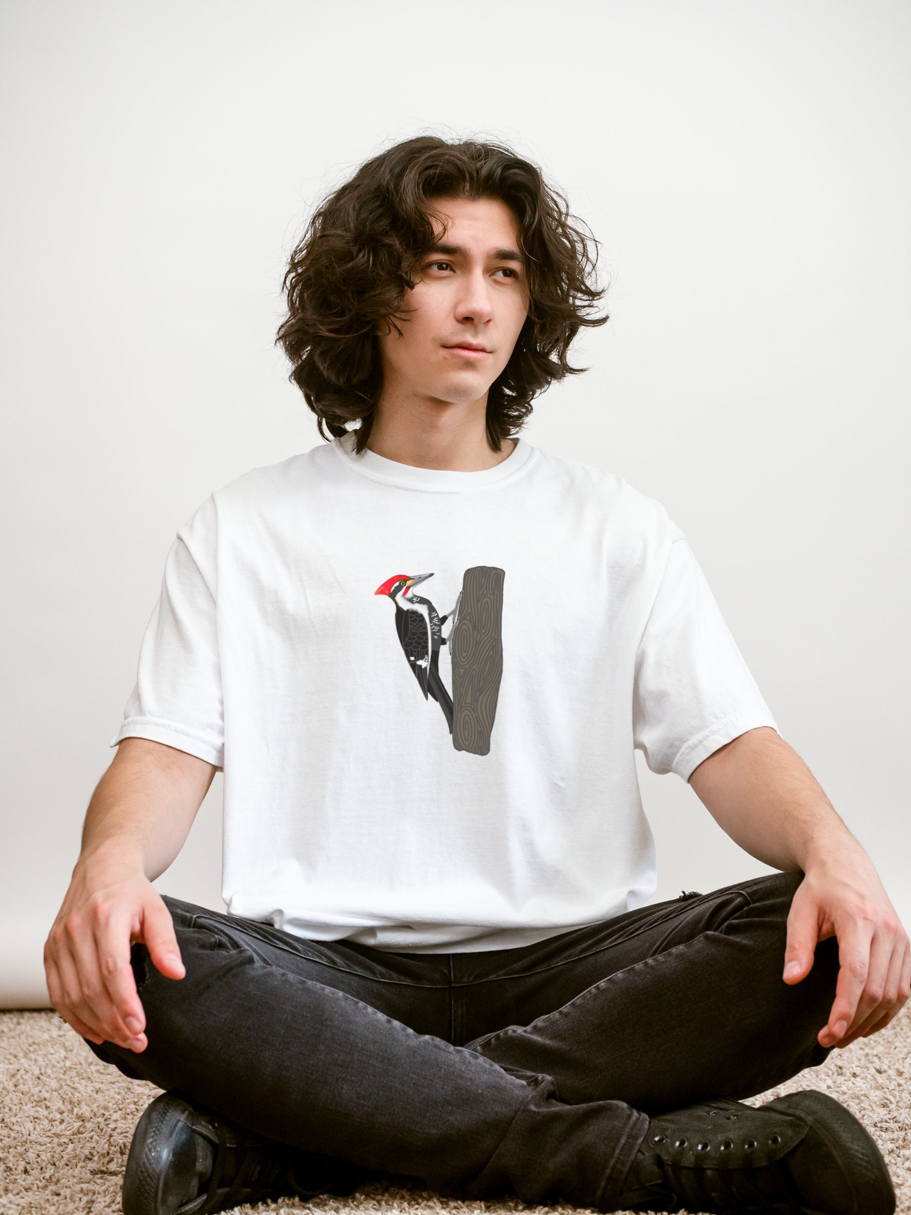 Pileated Woodpecker illustration designed by Emily Rose Thomson. The design was drawn and painted, then scanned to create a digital file to be printed on apparel