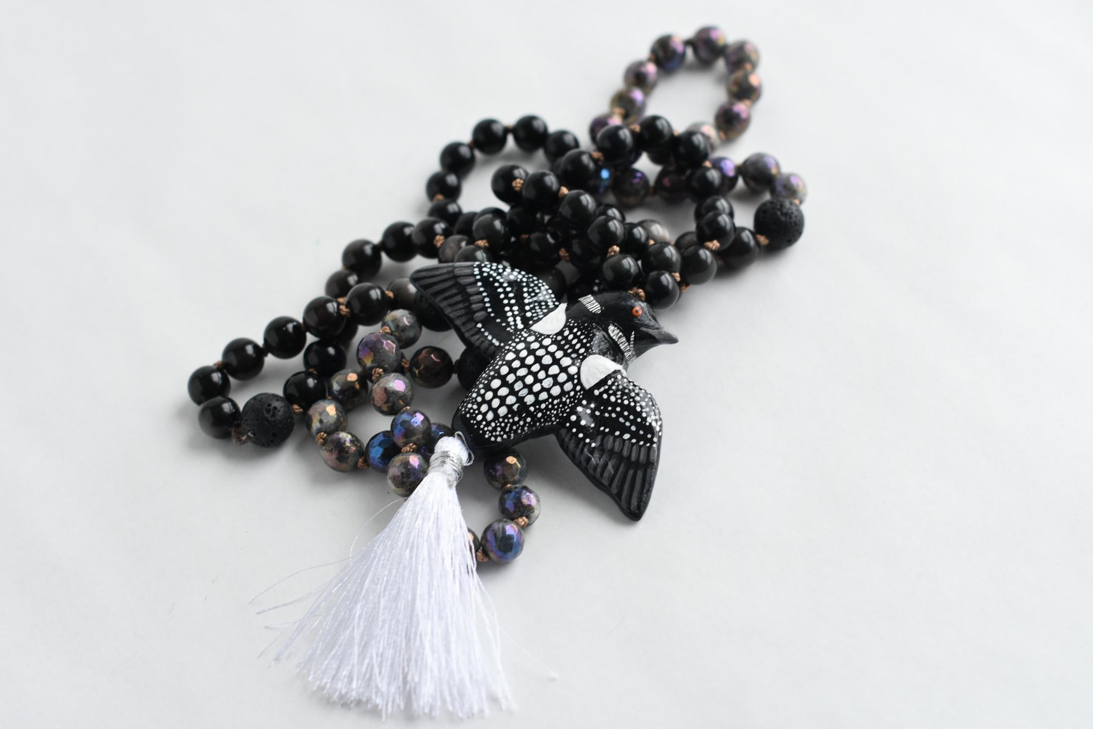 This will be a true mala necklace with 108 beads. The animal of your choosing will serve as the guru (teacher) bead and will be handmade from natural clay and painted with acrylic paints. The beads and tassel can be of your choosing. Due to the rarity and costs of some stones, the cost may be more depending on this factor. Tassels can come in a variety of colors- you can pick or I can pick for you.