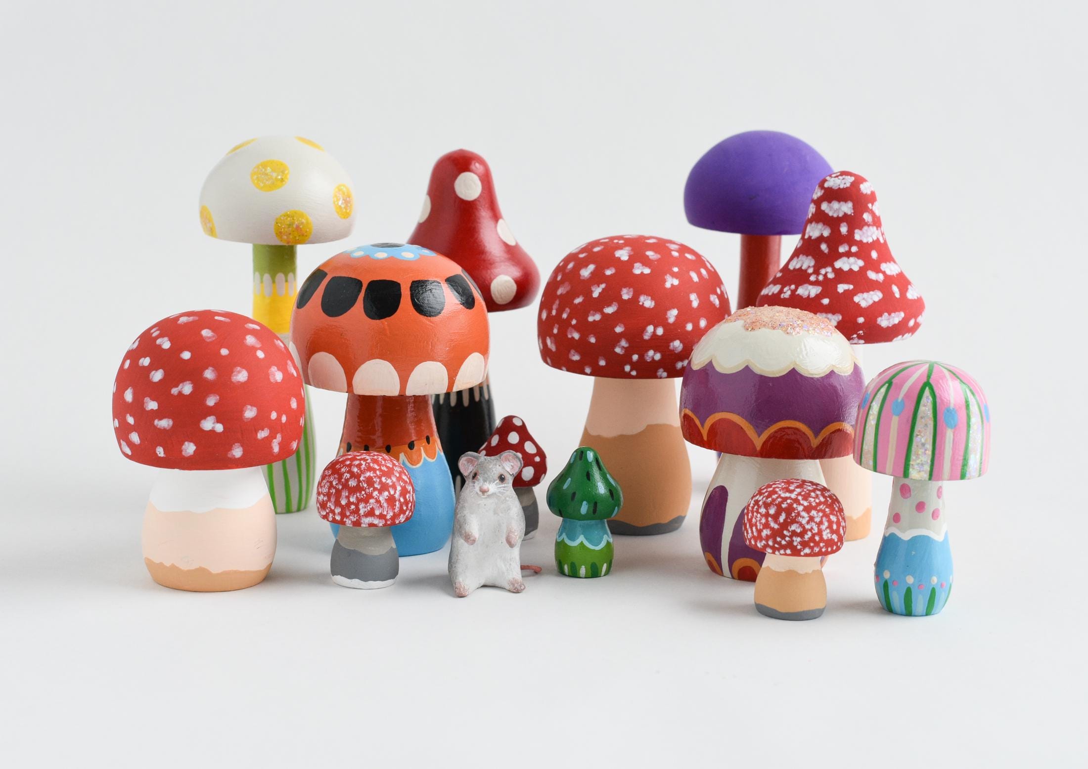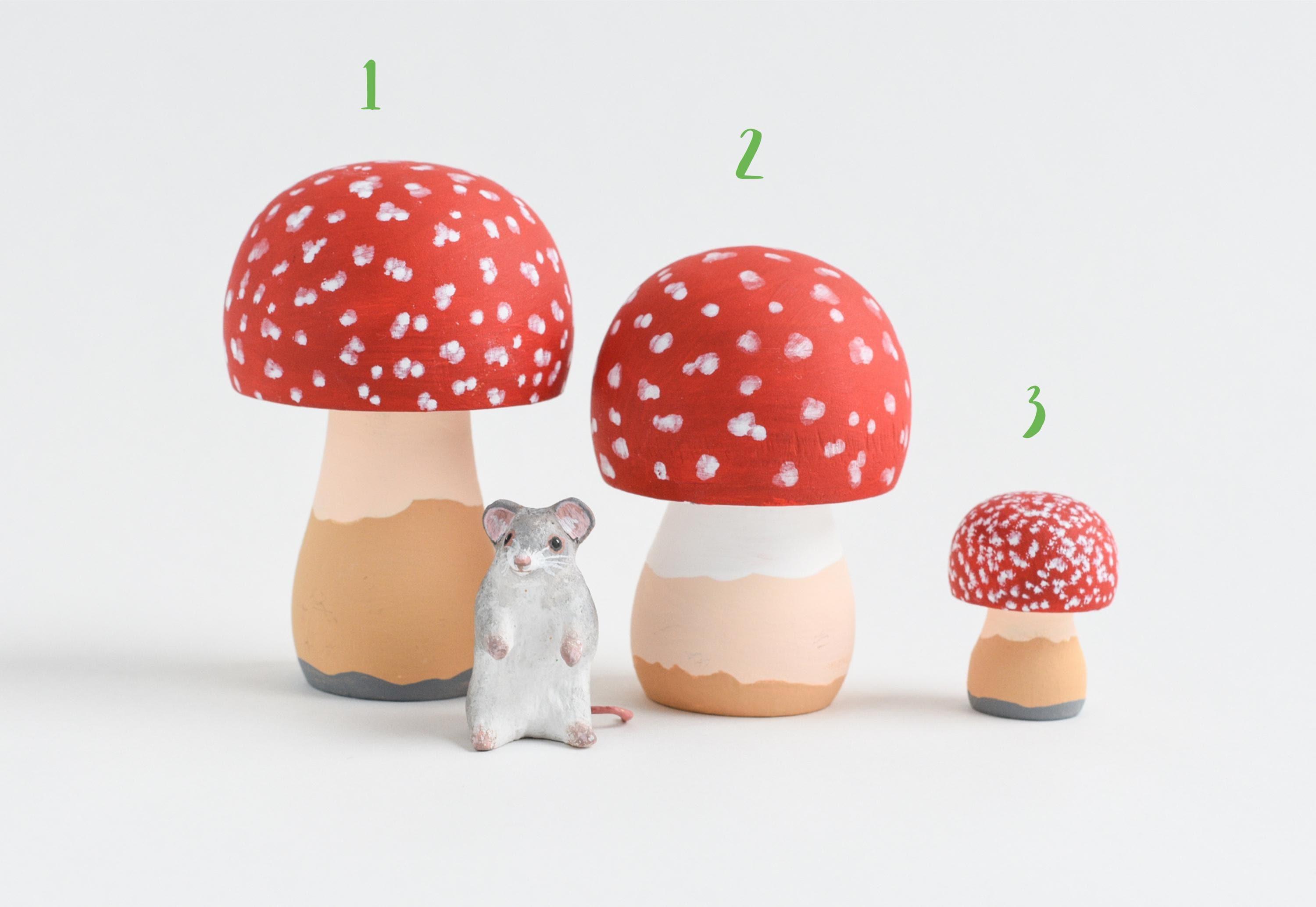 Hand-sculpted and painted wooden mushrooms with an optional tiny mouse companion! Each woodland set includes 3 mushrooms (choose your sizes and designs). Gift-boxed with free surprises — a perfect touch of forest magic for your home or fairy garden. 🍄🐭✨