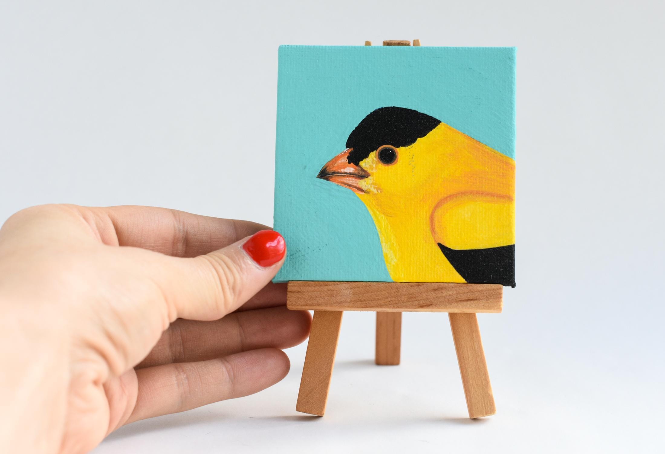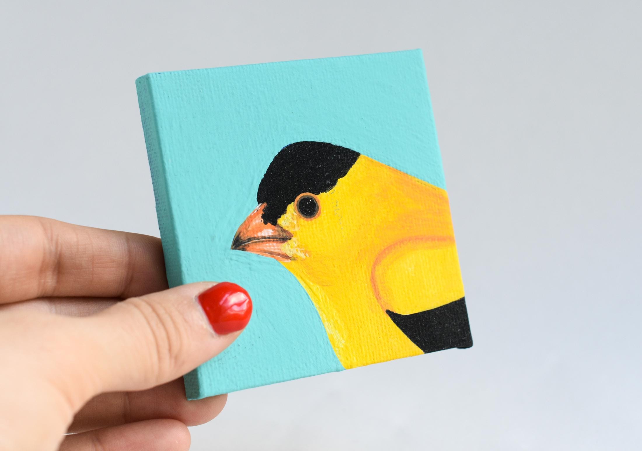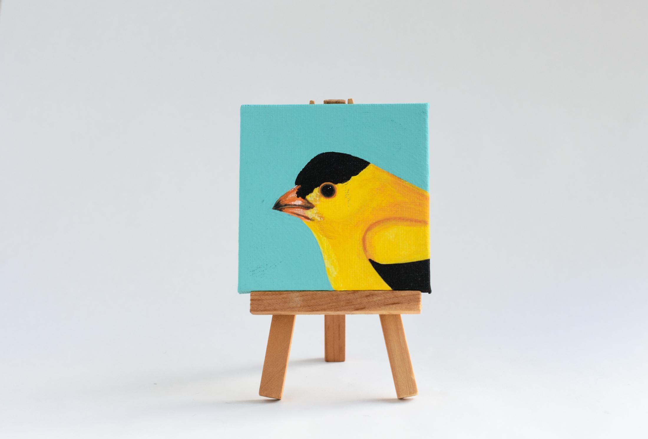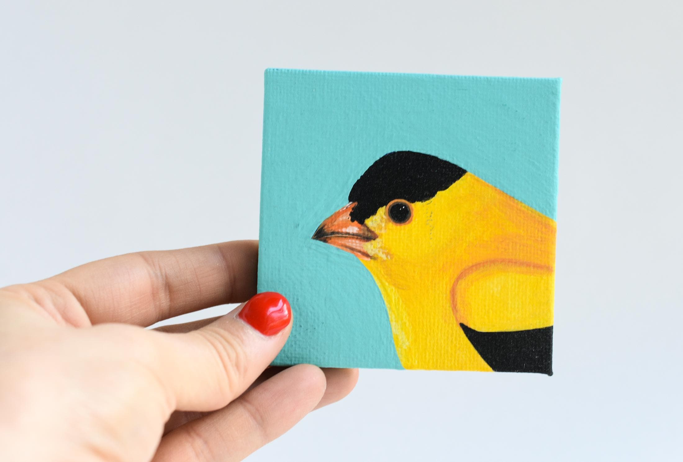 Mini 3x3 stretched canvas featuring a portrait of a goldfinch. An original painting by Emily Rose Thomson.